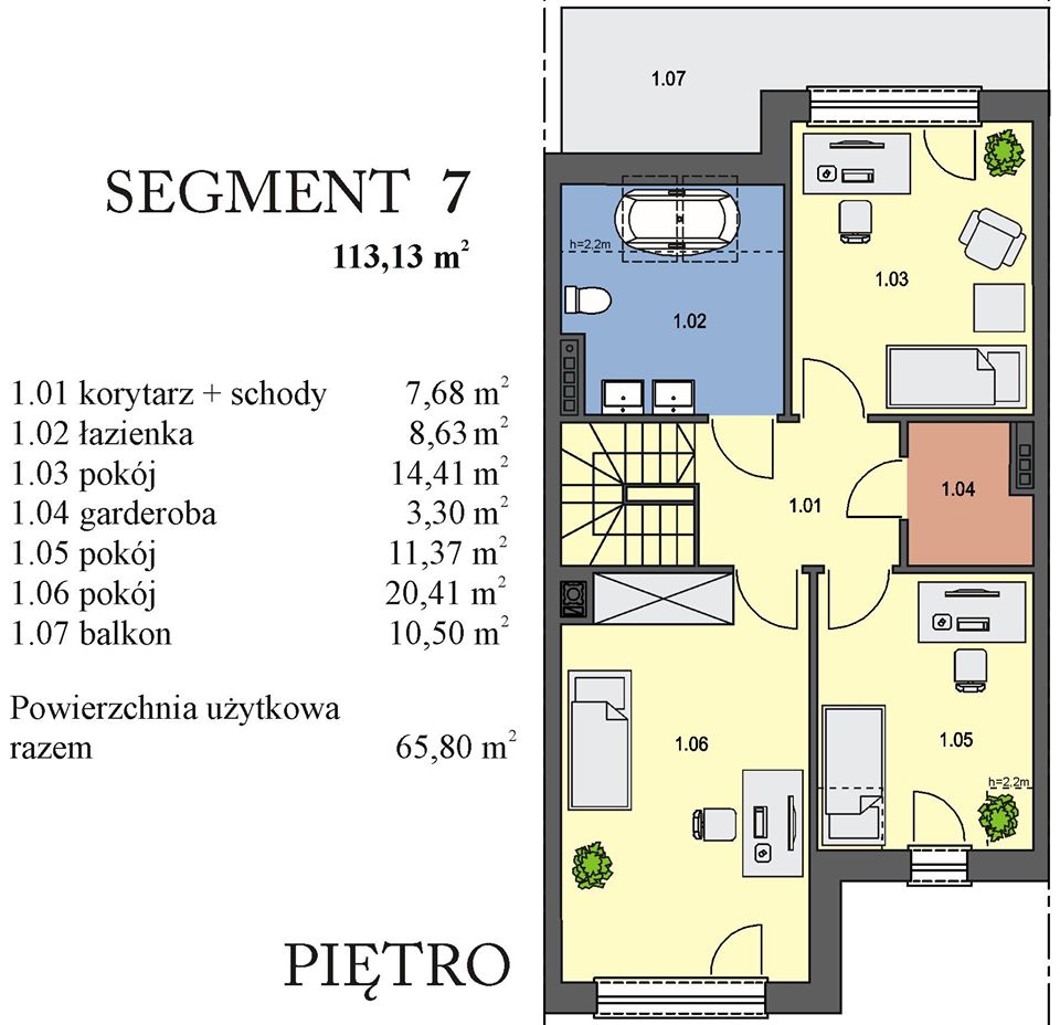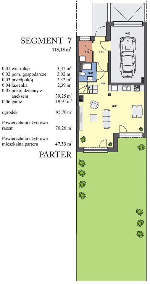 – pokój dzienny z aneksem kuchennym – 39.25 m2, z którego wychodzi sie do ogrodu o pow. 95.70 m2